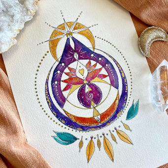 La (re)naissance de cette activité artistique et son lancement officiel m'est apparue comme une évidence à une étape importante de ma vie. Il était temps de reprendre les crayons et pinceaux pour peindre les étoiles. De mes partages spontanés sur les réseaux sociaux à la réalisation de vos créations personnalisées, il n'y eu qu'un pas. Parallèlement, j'ai développé mon site internet et créé en auto-édition l'oracle Étincelle. Pour mon plus grand bonheur, celui-ci est repéré quelques mois après sa sortie par un éditeur. C'est ainsi que j'ai travaillé à sa nouvelle version en 2022, pour une sortie officielle qui a eu lieu le 07 septembre 2023.